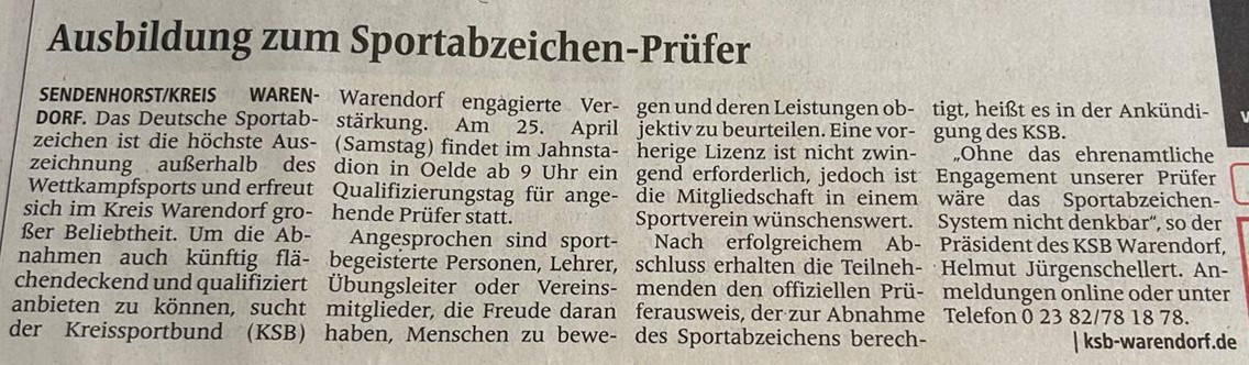 Einzige Prüferin, die der SVR aktuell aufweisen kann, ist allerdings Susanne Breloh. Da wäre es natürlich schön, wenn sich aus den SVR-Reihen noch weitere Sportabzeichen-Prüfer fänden. Passend dazu hat der KSB-Warendorf einen Qualifizierungstag am 25.04. ab 9.00 Uhr in Oelde ausgeschrieben. Es sind keine besonderen Vorkenntnisse erforderlich, nur eine Vereinsmitgliedschaft wäre wünschenswert, aber auch nicht Pflicht.